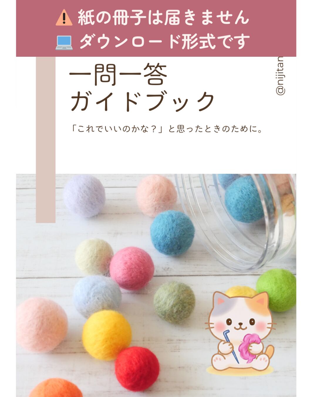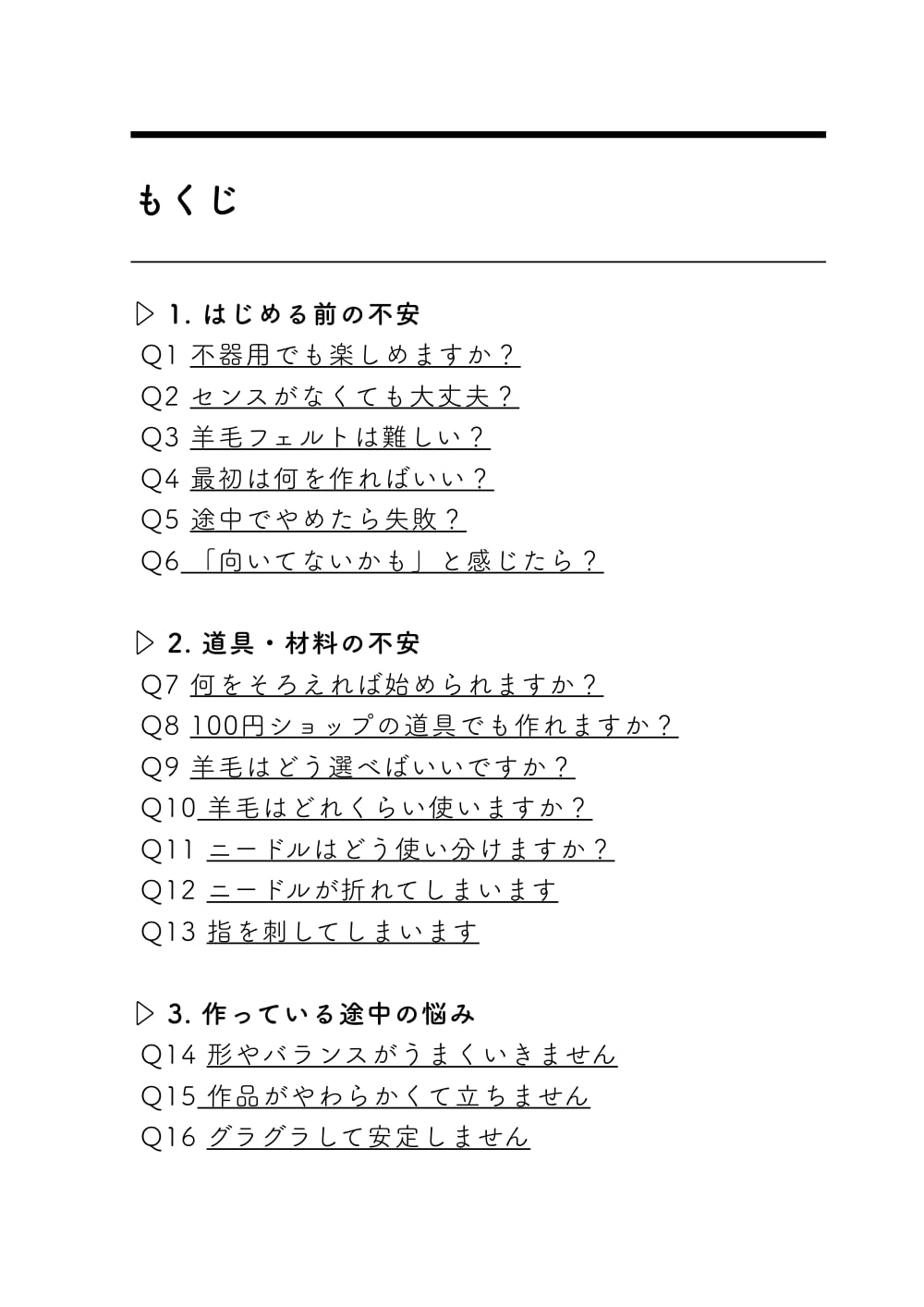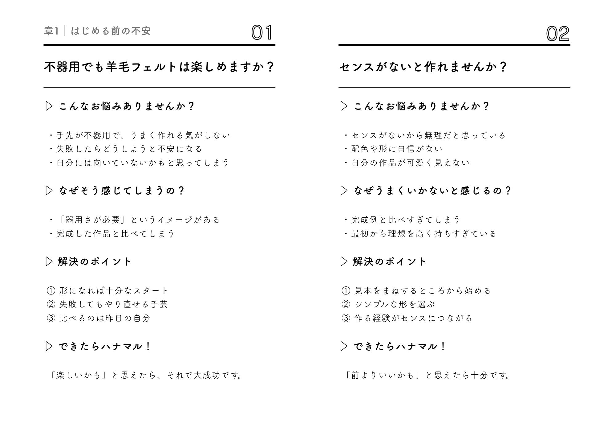 この一冊では、羊毛フェルトでよくある悩みをQ&A形式でやさしくまとめています。